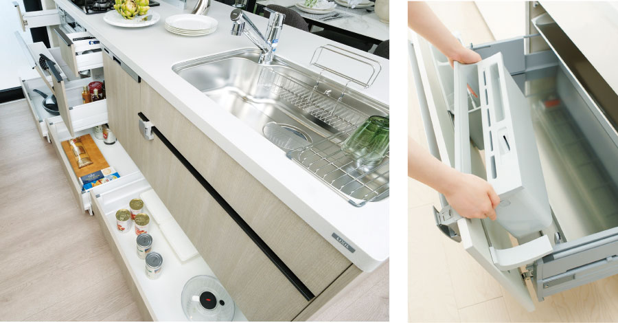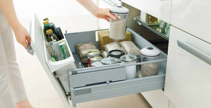 毎日の家事をもっとラクにしていただくために、キャビネットを開ける力をぐんと軽くしました。調理道具をたっぷりしまったキャビネットを開閉する時の労力を、大幅に軽減できます。
