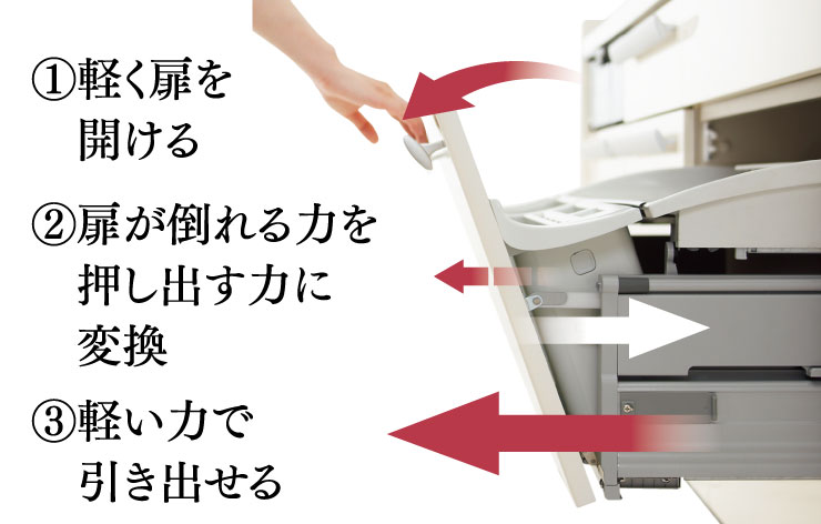 テコの原理を応用した斜めに開く扉だから、軽い力でラクに開けられます。