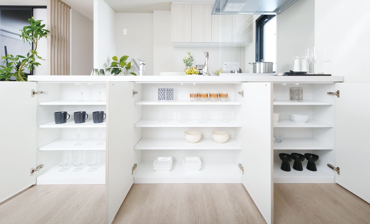 システムキッチンのダイニング側下部を有効活用し、お洒落な収納を確保。食器やナイフ・フォーク類、趣味の器などを収納できます。また雑誌や生活雑貨をまとめて収納すると、リビング・ダイニングの整理整頓に役立ちます。扉を閉めるとすっきりシンプルな表情です。