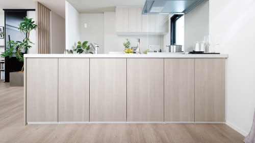 お手入れしやすく、しっとりとした質感が魅力の人造大理石カウンター。お料理の際、段差の無い広いスペースで作業できるのでとても便利です。