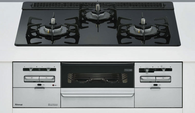 スタイリッシュなガラストップコンロを標準装備。水をはらずに一度に両面を焼けるグリルは、調理時間を短縮してくれます。トップはガラス素材のため、日頃のお手入れも簡単です。過熱防止や消し忘れ消火などの安全機能「Siセンサー」付きなので安心です。