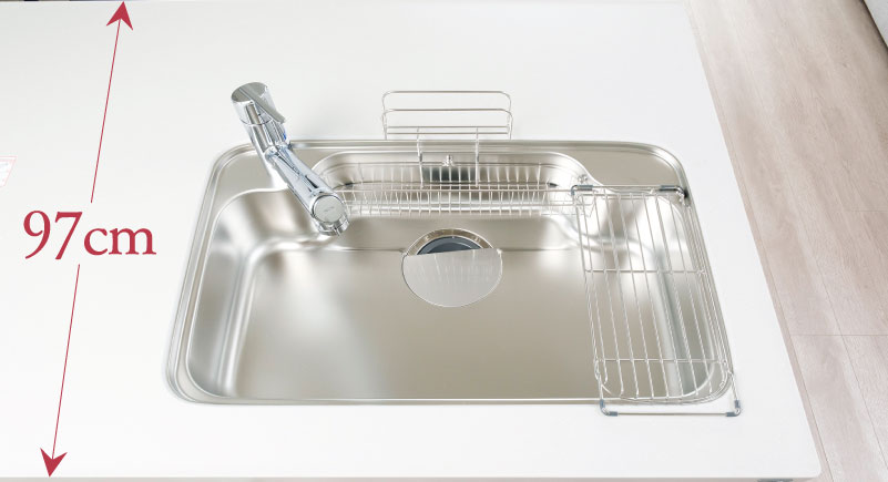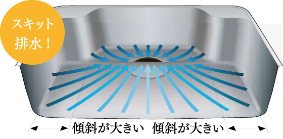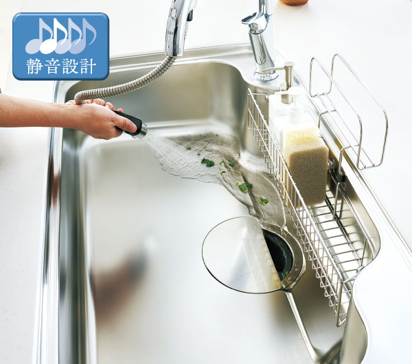 シンク裏面に振動を軽減する素材を貼ることで水はね音を抑えた静かなシンクです。さらに、底面の傾きが左右の両端に行くほど大きくなる新形状。水が広がりにくく段差へスムーズに流れ、効率よく排水できます。
