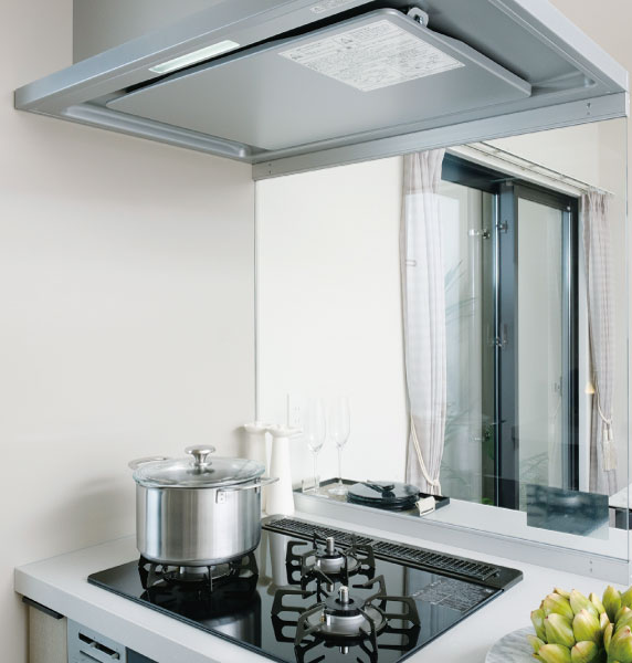 スタイリッシュな外観のスリム型レンジフードです。フード部の内部は、お手入れしにくいカドを減らし、清掃性に配慮しています。
