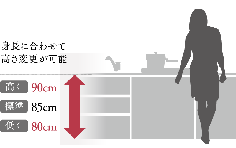標準のカウンターの高さは85cmです。腰などの負担に配慮し、ご希望で±5cmの高さ変更が可能です。
