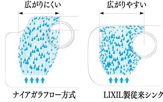 ナイアガラフロー方式は、LIXIL製従来シンクに比べて水流が広がりにくく、水が直線的に流れます。