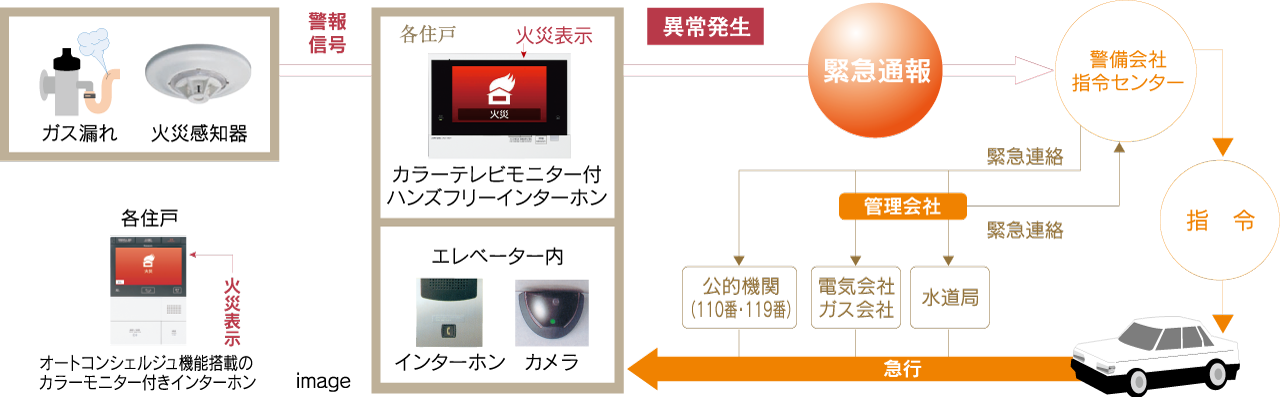 万一の火災時には各戸に設置された感知器より警備会社へ自動通報。また、エレベーター内で異常が発生した場合は非常ボタンを押すとエレベーター会社へ通報が行き、迅速に対応してくれます。24時間対応システムで、安心・安全を提供します。