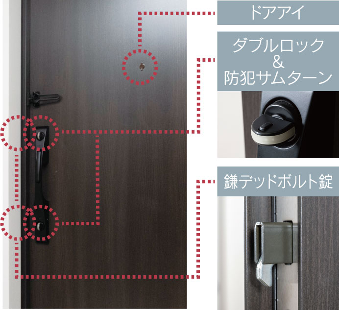 錠穴を2カ所施したダブルロック式で、防犯性を向上。プッシュプルハンドルなので開けやすく、使い勝手に優れています。また鎌デッドボルト錠がドアのこじ開けを防止。さらに不正解錠への防犯効果を高めるために、回転防止機能付きドアアイやスイッチを押しながらでなければ回らない防犯サムターンを採用しました。