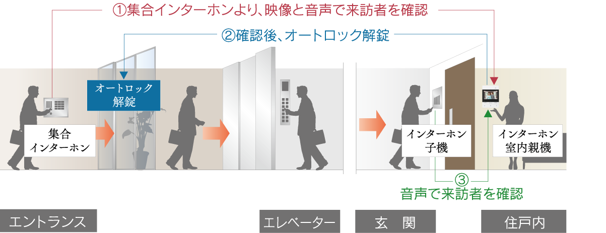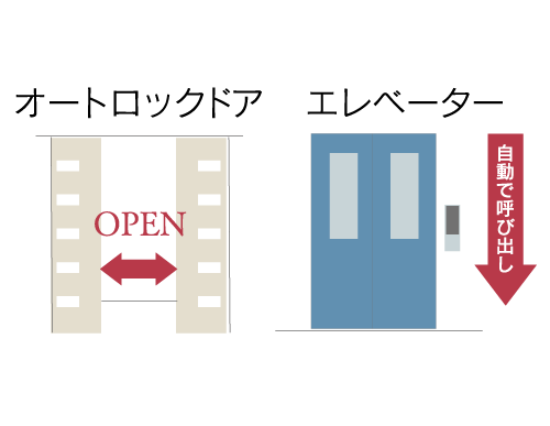 オートロックドアが開き、エレベーターを自動的にエントランス階まで呼び寄せます。