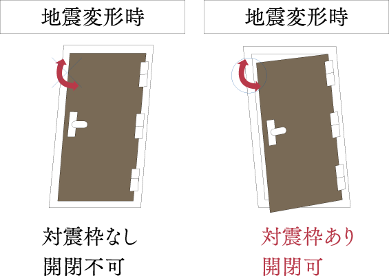 対震枠とドアのクリアランスを通常より広く取っておりますので、地震時でも扉が閉ざされにくくなっております。また、バールでのこじ開け防止など、防犯性も高めています。