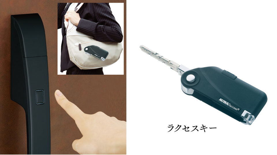各住戸の玄関は、ラクセスキーをバッグやポケットの中から取り出すことなく、グリップのボタンをワンタッチするだけで、「施錠」「解錠」することができます。通常の鍵のように、鍵を差し込んだりかざしたりする必要がありません。