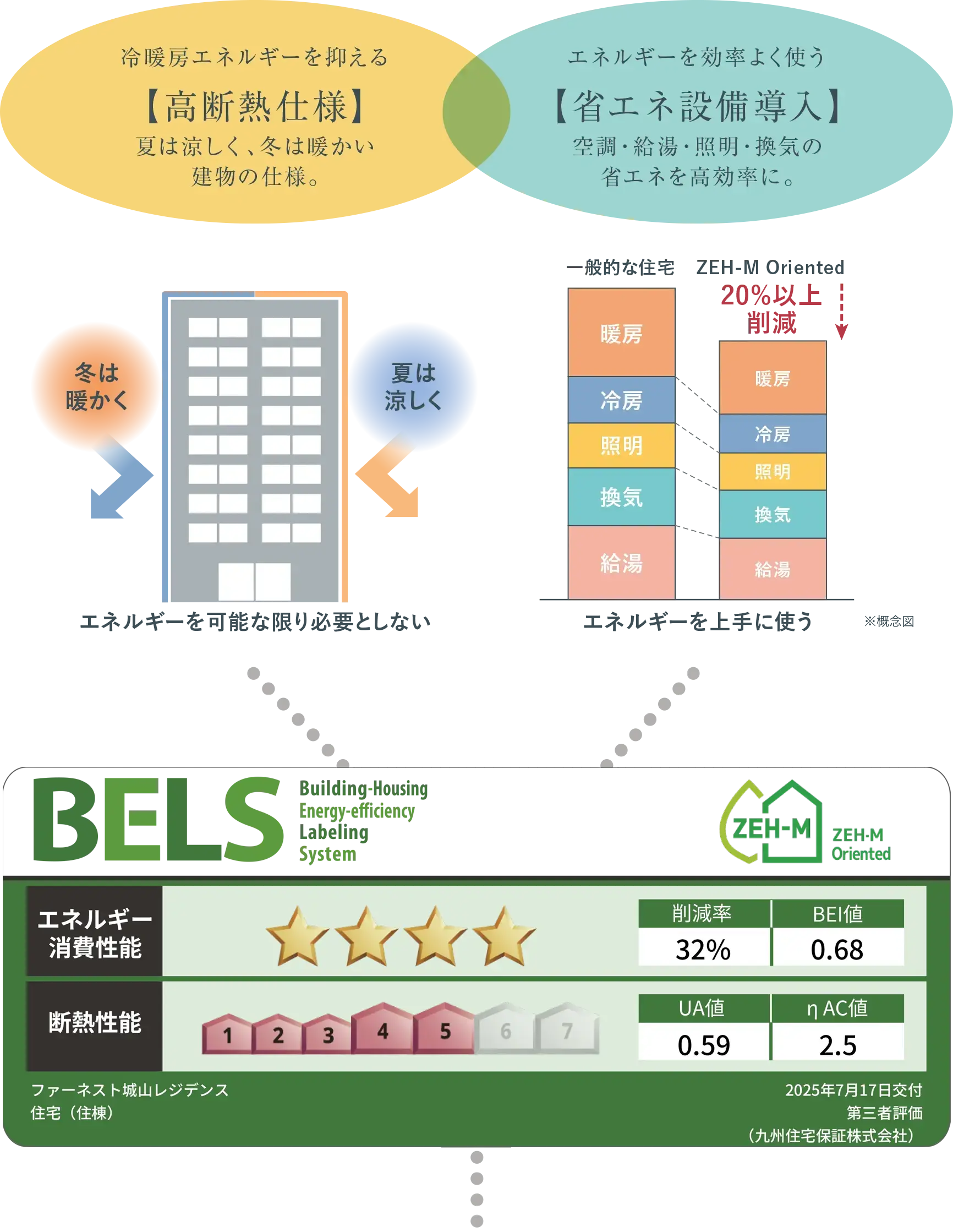 外壁等の断熱性能を高め、高効率な省エネ設備の導入により、一次エネルギー消費量を20%以上削減可能なマンションに与えられる呼称です。