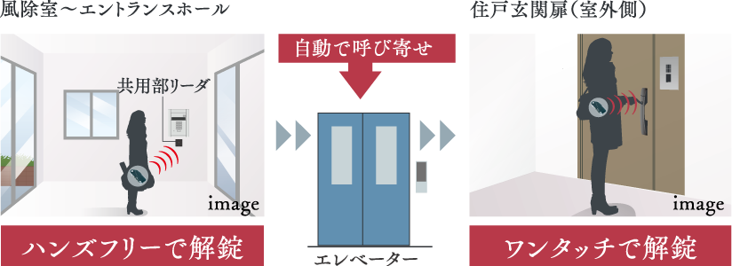 鍵をバッグやポケットの中から取り出すことなく、エントランスや玄関の解錠が簡単な先進のキーシステムを採用。玄関の施錠・解錠は外側グリップのボタンをワンタッチするだけ。さらに、エレベーターや宅配ボックスとも連動しています。
