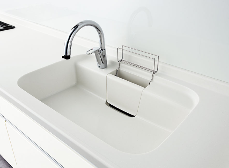 人造大理石ならではの優しい質感を生かしたデザインに加え、継ぎ目の目立たないシームレス加工でお手入れも簡単。いつも清潔なキッチンを保てます。